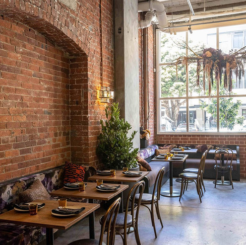 The space itself telegraphs this philosophy before a single dish arrives. Housed in a beautiful corner bluestone building with expansive windows, the interior embraces Melbourne's industrial-chic aesthetic while injecting substantial personality. Exposed brick provides the expected contemporary framework, but the execution veers into deliberate eccentricity: velvet banquettes clash with mismatched cushions, second-hand furniture creates visual irregularity, and an improbable cloud chandelier constructed from grey-black tulle hovers overhead. Staff move through the space in belted black robes that suggest gothic togas, though their warmth and engagement counteract any pretension the costume might imply.