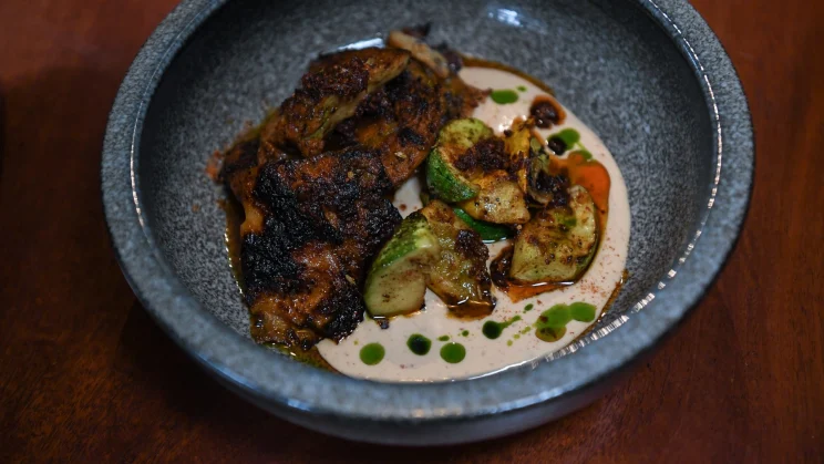 The open kitchen anchors the room, its centerpiece flame grill generating both heat and theater. A room-length planter box filled with fruiting chillies reinforces the commitment to bold flavors. The atmosphere pulses with energy, cranked music, communal seating, tables packed close enough to create ambient noise without confusion. This is a party that serves food, not a restaurant that occasionally loosens up.